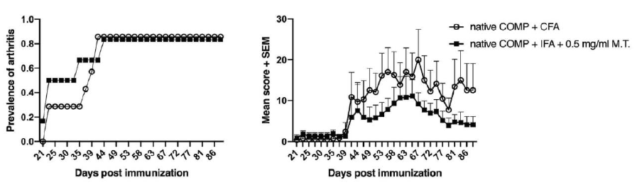 初次免疫佐劑選擇(CFA或IFA)可能會影響疾病的嚴重程度。相對含有結(jié)核桿菌的(Mycobacterium Tuberculosis H37Ra)IFA,CFA(2mg/ml M.butyricum)會導致更嚴重的炎癥。不管初次免疫的佐劑如何選擇,預計的發(fā)病時間都是相同的。加強免疫后預計出現(xiàn)更嚴重的炎癥(