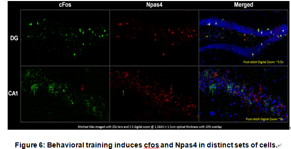 最后,鑒于npas4相對于fos和其他傳統(tǒng)IEG的獨特調(diào)節(jié),以及c-fos非常普遍用于標(biāo)記被認(rèn)為是“記憶痕跡”或“印跡”的活動依賴性神經(jīng)元集合的事實,我們想確定npas4和fos是否標(biāo)記了相同的神經(jīng)元群。為此,我們進行了RNAScope原位雜交實驗,觀察cFC后的兩個轉(zhuǎn)錄本。在海馬體的齒狀回區(qū)域,發(fā)現(xiàn)了一個明顯重疊的最近激活的神經(jīng)元群。