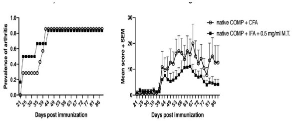 圖1.COMP誘導(dǎo)C57BL/6小鼠具有高發(fā)病率和嚴(yán)重程度的關(guān)節(jié)炎。小鼠用COMP+CFA佐劑(n=7)或IFA+0.5mg/ml結(jié)核桿菌(n=6)免疫,第35天加強(qiáng)免疫。關(guān)節(jié)炎發(fā)病率(左側(cè))和關(guān)節(jié)炎評分(右側(cè))。