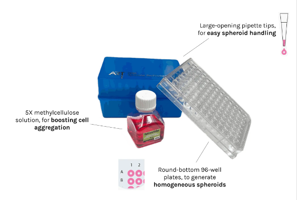 In addition to the SpheroTribe solution, the full kit also includes U-bottom plates and wide-opening tips so you have everything you need to get started with your 3D cell culture experiments.