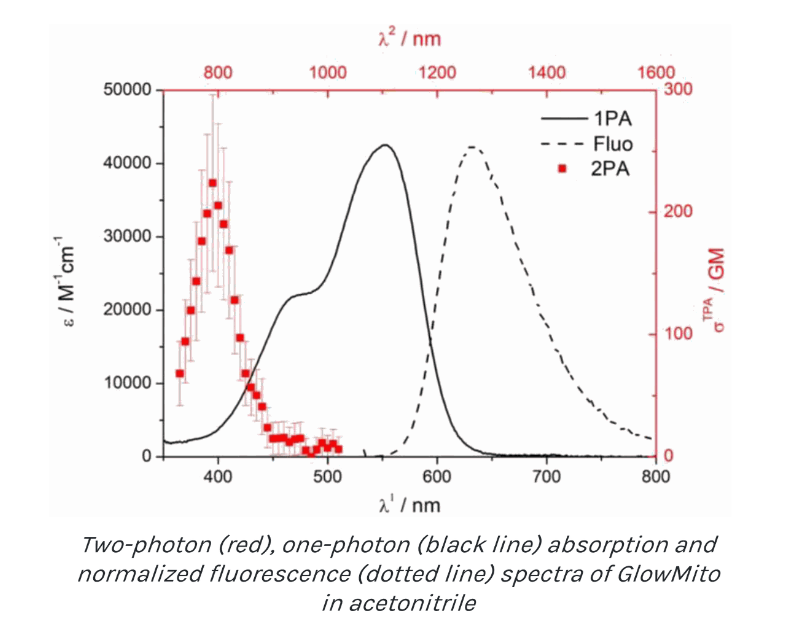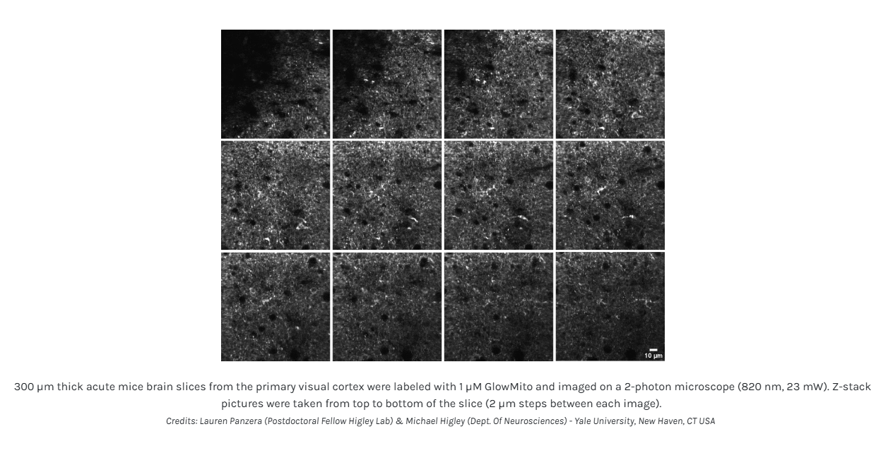Soluble in water and compatible with 2-photon microscopy, GlowMito is the solution of choice for thick tissues and in vivo experiments.