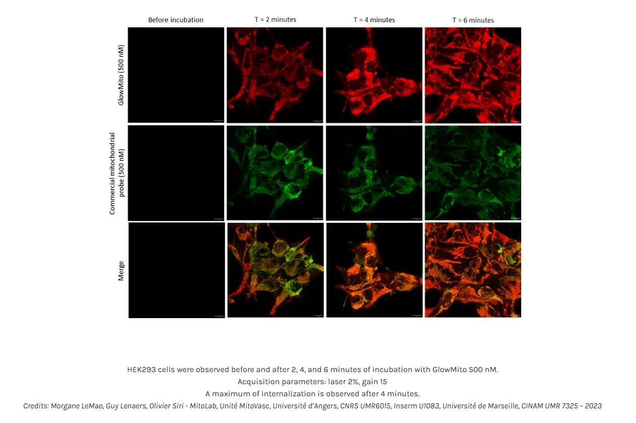 GlowMito can be used in combination with other probes (GFP, potentiometric dyes, calcium signaling probes, etc).