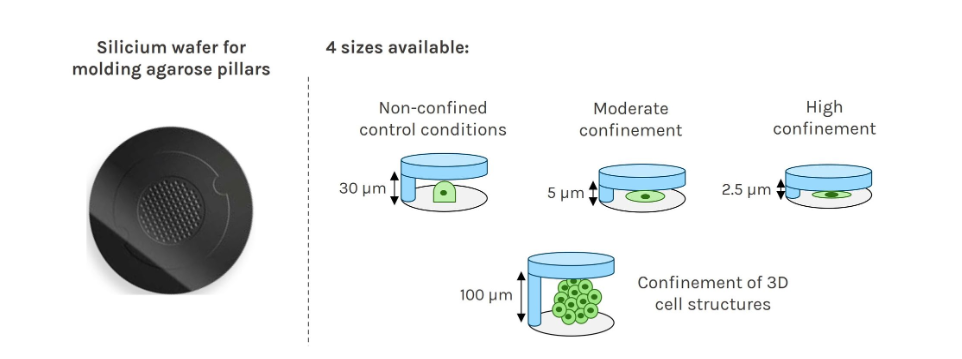 In addition to basic kit contents, we recommend using a silicium wafer to mold your confining pillars in agarose. We provide four different wafers to mold pillars of various heights. Choose among our four pillar heights available depending on your desired application and add silicium wafer(s) to your order here.